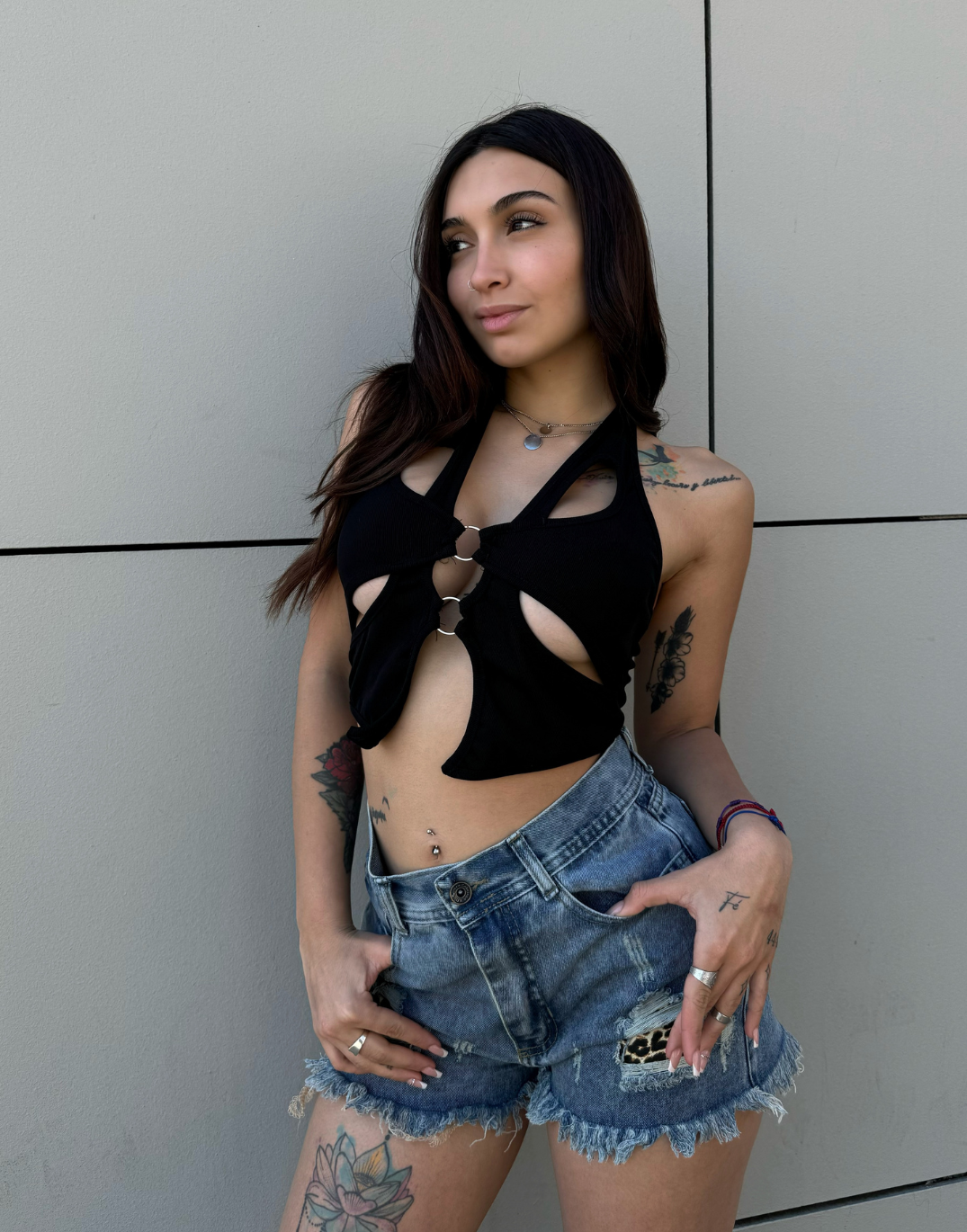 Short rÃgido , tiro medio detalles de desflecado en las piernas y roturas con animal print en los bolsillos delanteros.