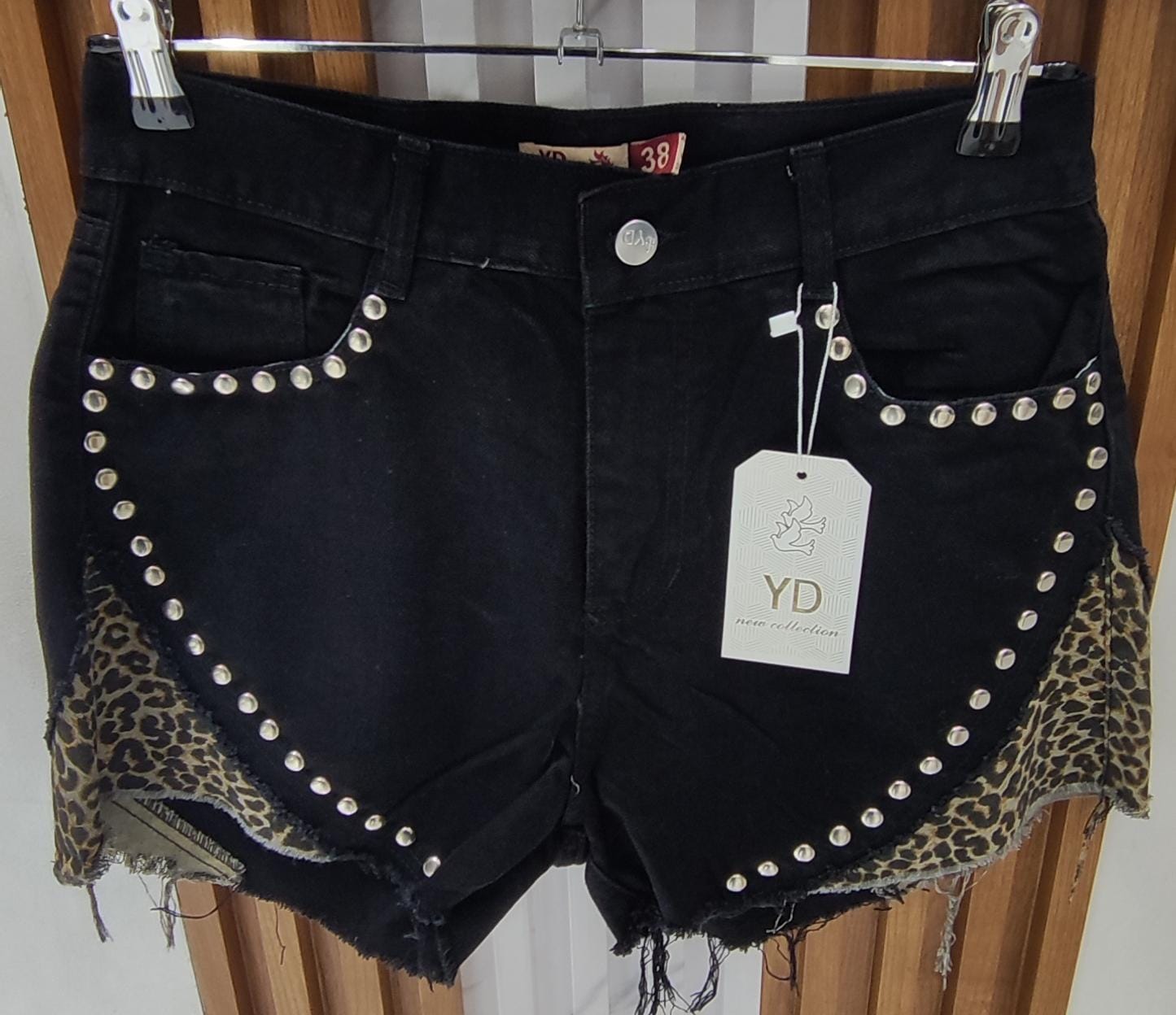 Short rÃgido , tiro alto, detalles de tachas planas en las caderas ,corte de animal print y desflecado en las piernas