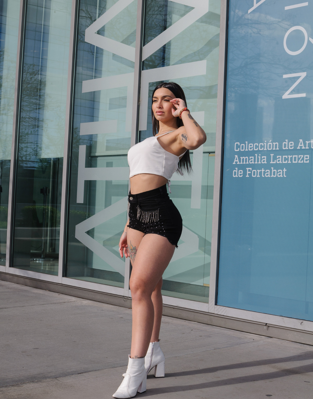 Short elastizado tiro alto detalles de brillo strass en la parte frontal, flecos de strass en los bolsillos y desflecado en las piernas.