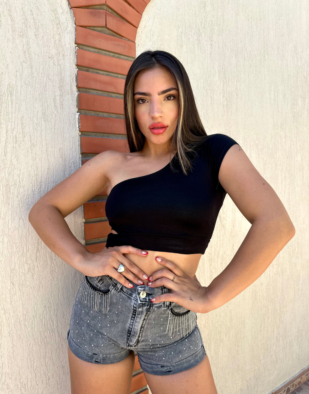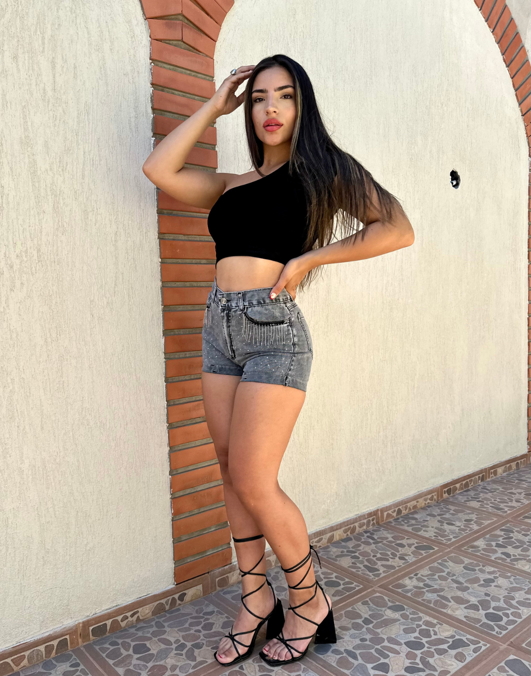 Short elastizado tiro alto detalles de brillo strass en la parte frontal, flecos de strass en los bolsillos y desflecado en las piernas.