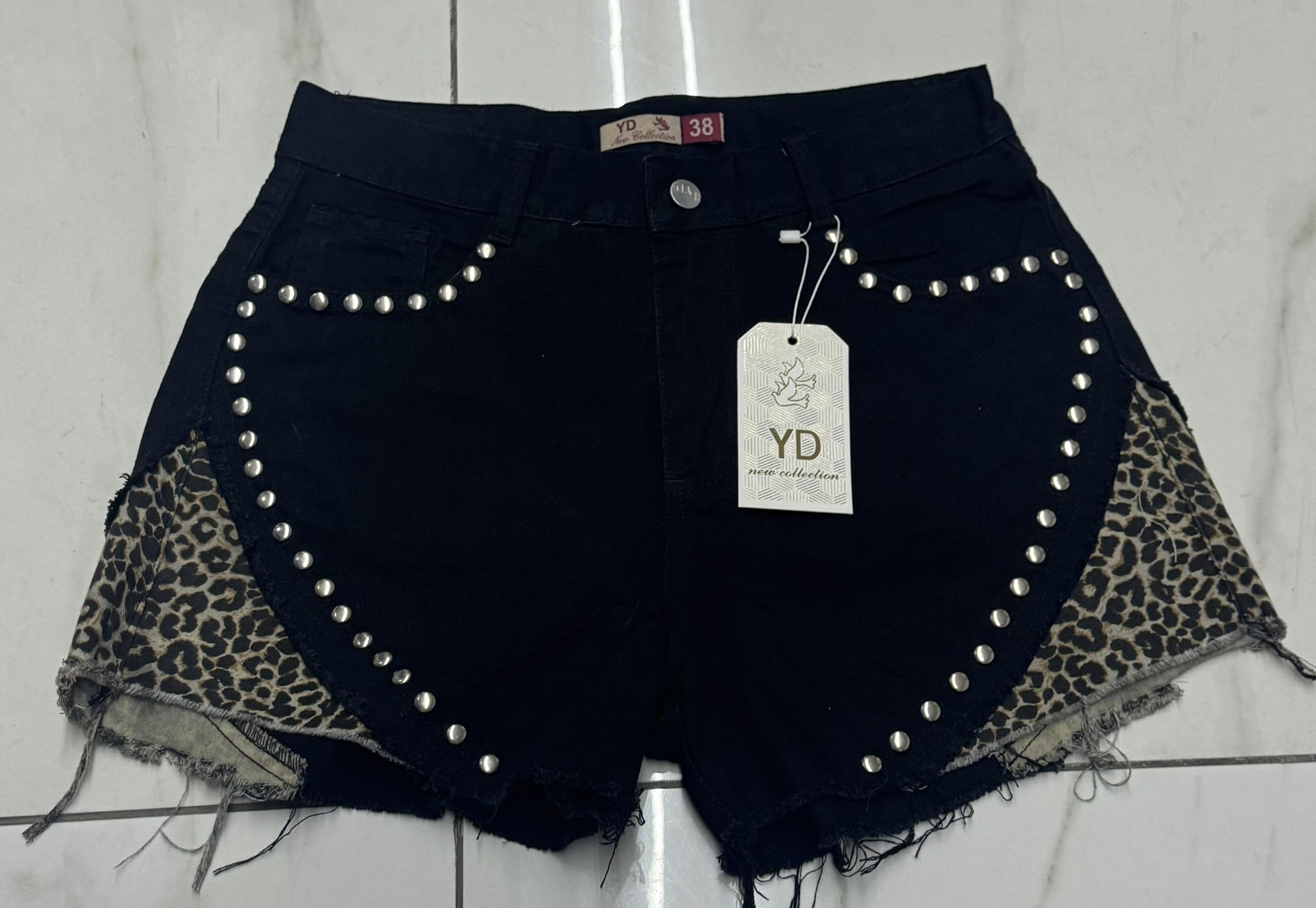 Short rÃgido , tiro alto, detalles de tachas planas en las caderas ,corte de animal print y desflecado en las piernas