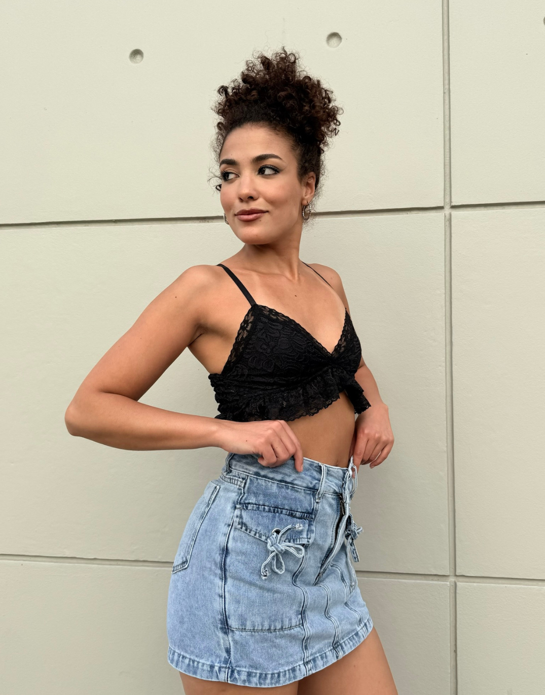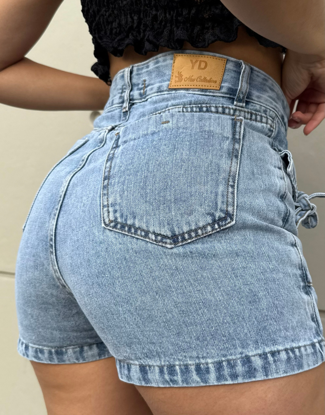 Short Pollera rÃgido, tiro alto con detalles de lazos en los bolsillos delanteros.