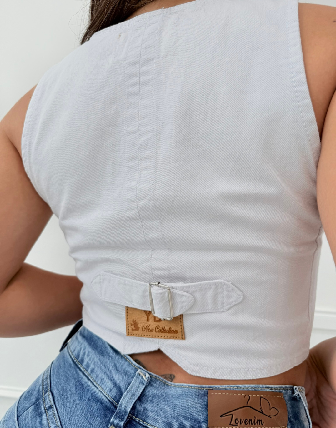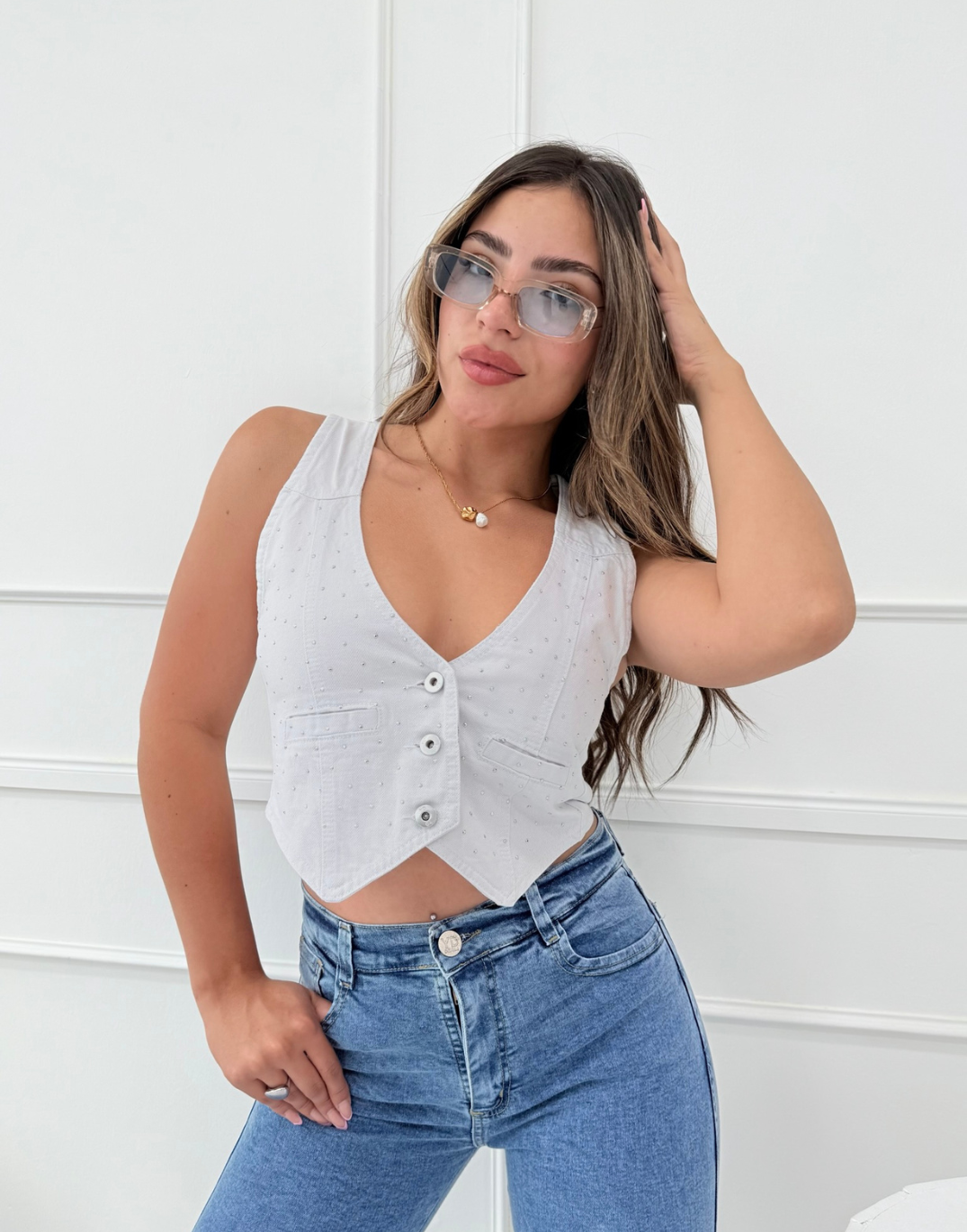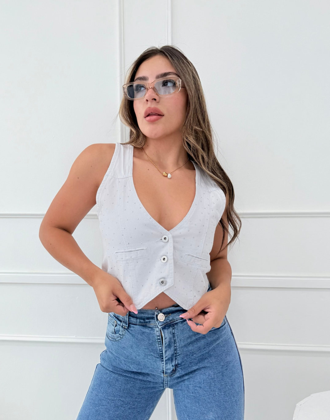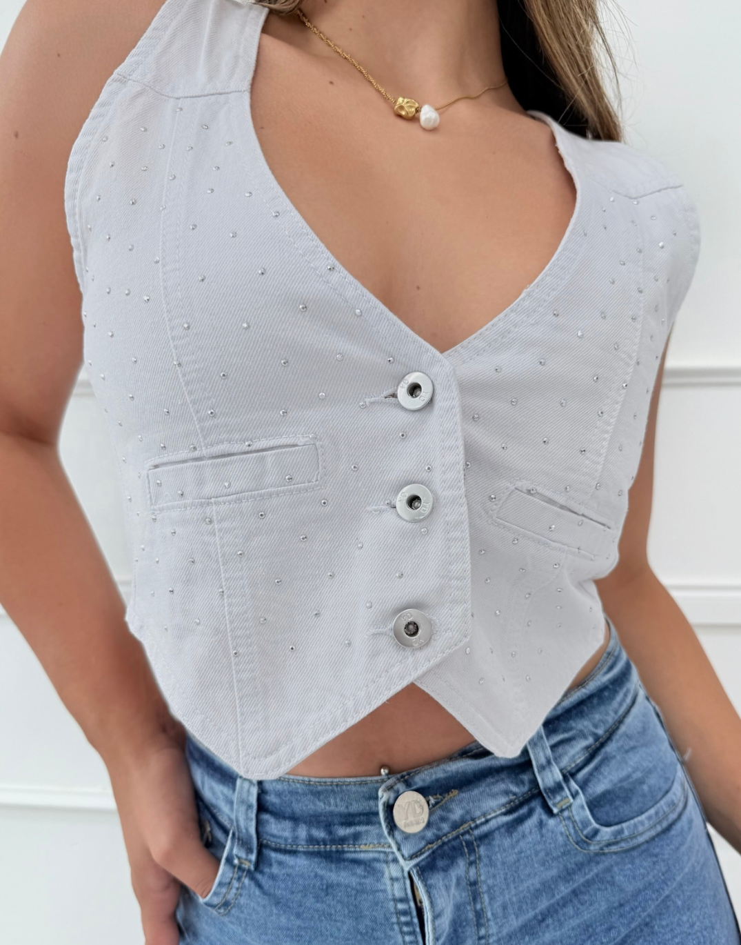 Chaleco rÃgido con detalle de hebilla en la espalda y corte del pecho en v con brillo.